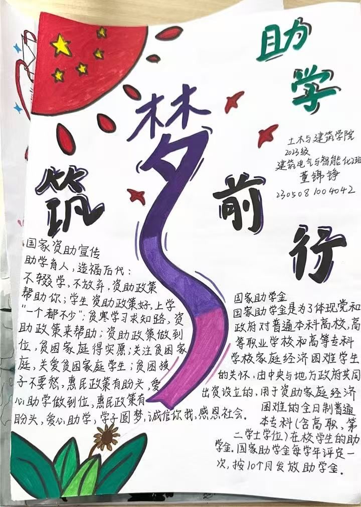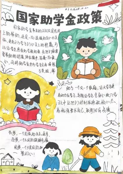 本次活动围绕“资助政策解读”、“励志成长故事”等主题,鼓励学生将画笔与文字有机结合,通过手抄报的形式生动展现国家资助政策带来的温暖与力量。同学们踊跃参与,作品内容丰富、形式多样,既有对政策的精准图解,也有真实感人的成长经历,传递出浓厚的感恩之情与奋发向上的精神风貌。