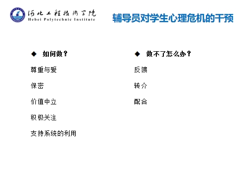 本次讲座的受众主要是辅导员,李佳丽老师在讲座的最后着重讲解了辅导员对学生心理危机的干预。首先,辅导员在与心理异常的同学沟通时要做到尊重与爱和价值中立,对访谈内容要做到保密,并对该学生做到积极关注,充分利用大学生心理健康教育指导中心的支持作用,如感觉该学生问题较严重则需要反馈给英国365心理健康教育指导中心。若心理咨询已无法帮助该学生,则需要转介到精神科或心理科。