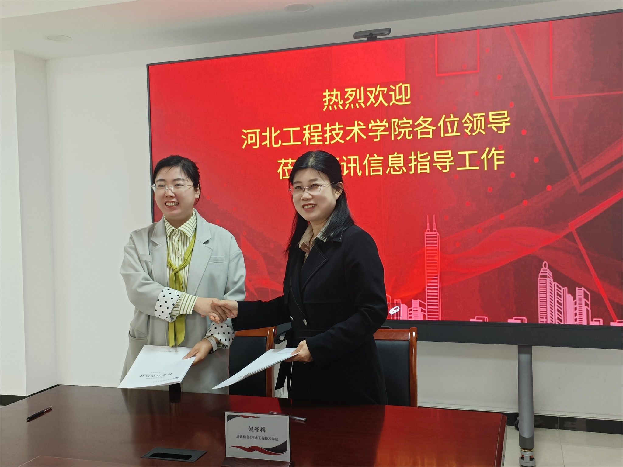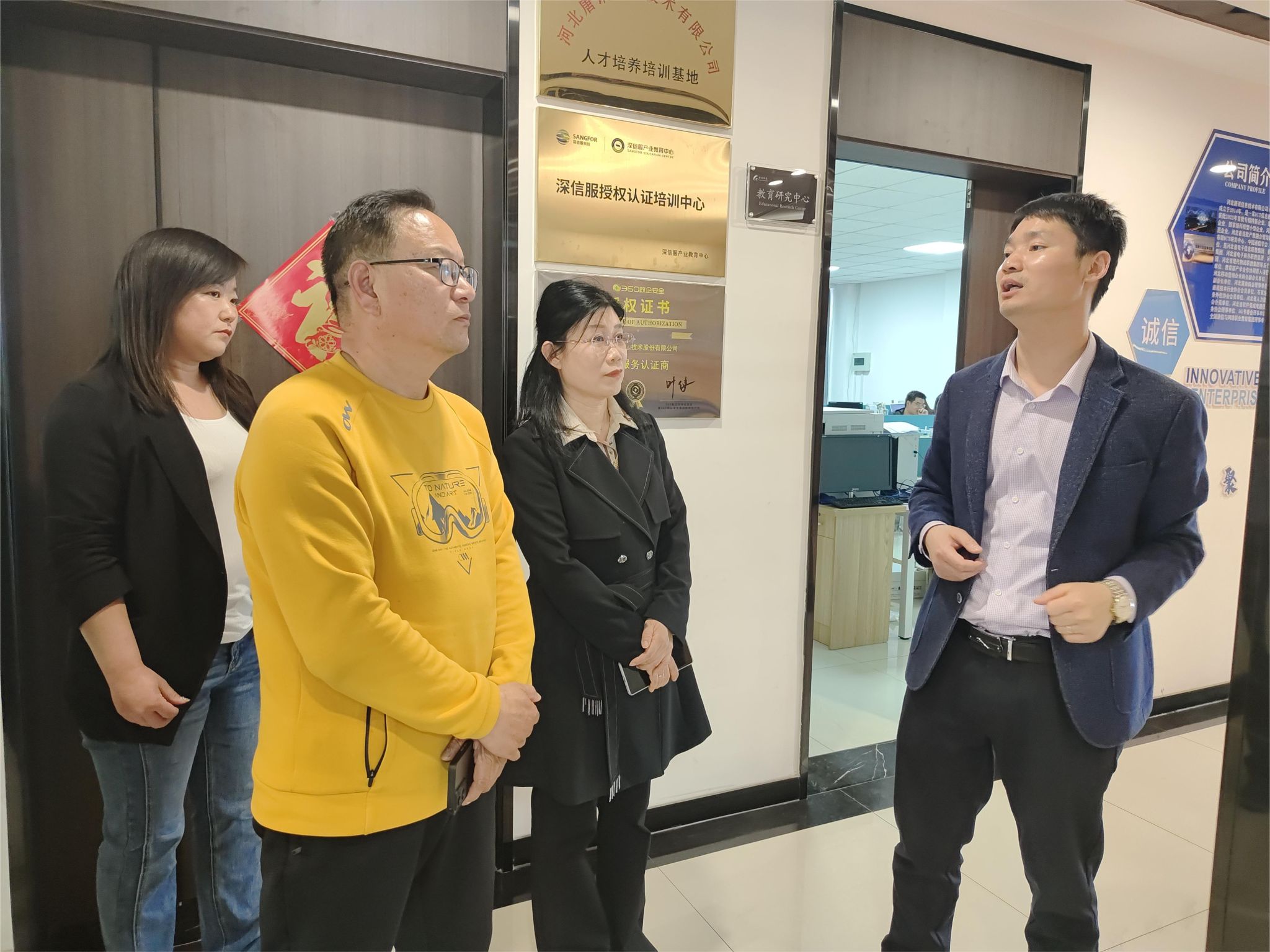 调研组首先来到位于新一代电子信息产业园区软件大厦四层的河北唐讯信息技术股份有限公司走访调研,在公司总经理王玉江、党支部书记李志虎、副总经理杨雅慧的陪同下,参观了公司发展历程荣誉展厅和新一代通讯技术产教融合成果展厅,听取了公司与省内外高校开展产教融合协同育人工作的情况汇报。参观结束后,校企双方举行了产教融合协同育人座谈会,并举行校企合作签约授牌仪式。英国365软件学院院长赵冬梅和河北唐讯信息技术股份有限公司副总经理杨杨雅慧代表校企双方签署了校企合作协议;对外合作部部长王俊昆为企业颁授“校外实习实训基地”牌匾。