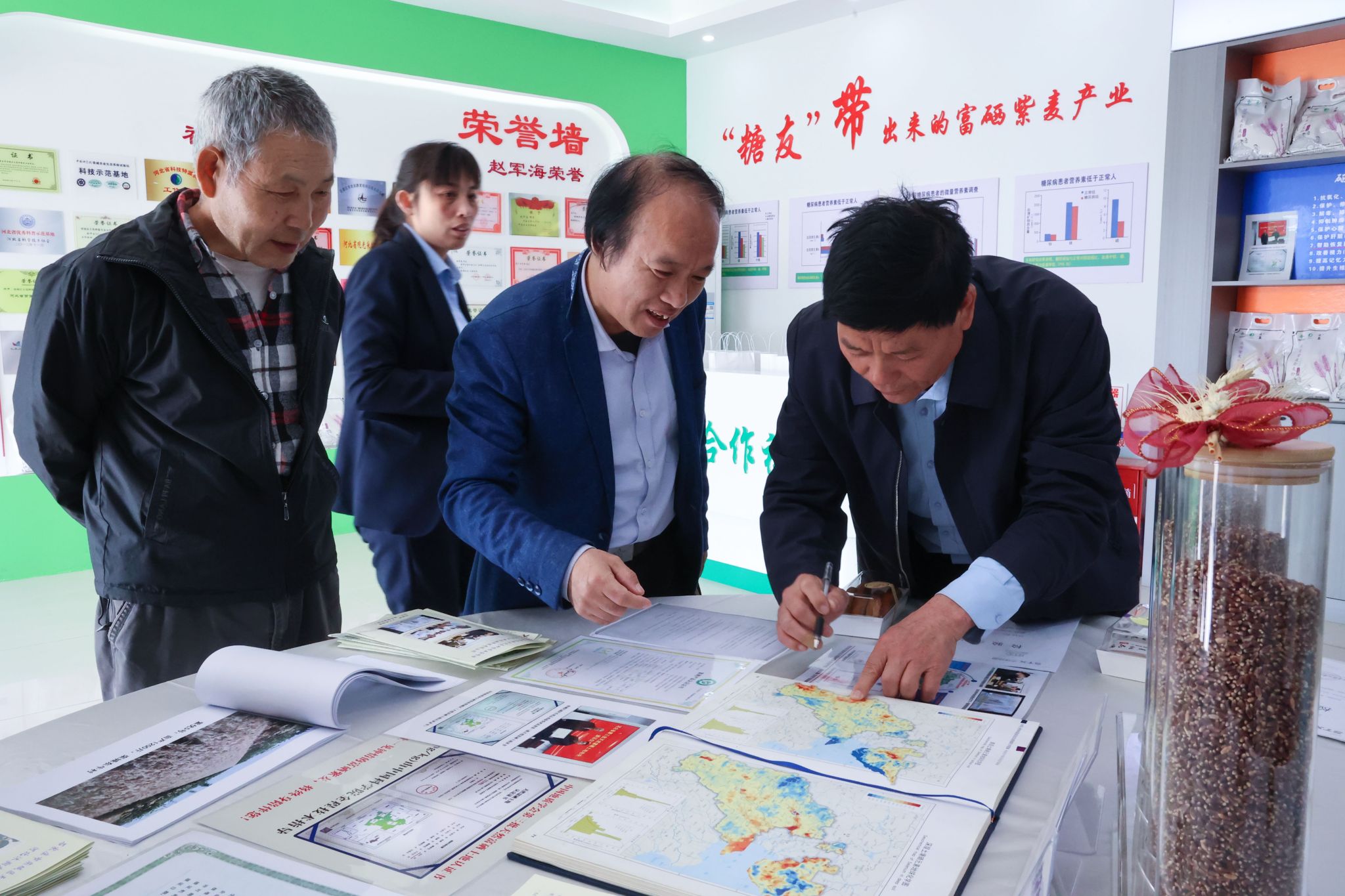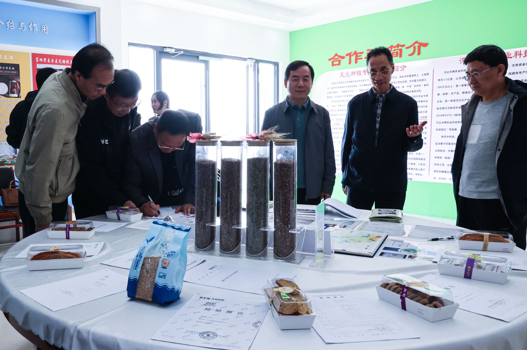出席签约授牌仪式的嘉宾有栾城区科学技术协会主席白智贤、栾城区供销社主任王瑞锁、栾城区东牛村驻村工作组长赵振奎、栾城区农广校校长贾增健、栾城区柳林屯乡人大主席王亚宁、中科院创新研究员张正斌、栾城区宣传部原副部长王增强、栾城区天亮种植合作社董事长赵军海;石家庄市东区供销有限公司董事长刘世芳、总经理曹晓磊;英国365上市公司校长助理武勇、商学院院长王明吉、科研与产教融合处副处长王俊昆、商学院副院长姜玉婕、商学院副院长王昊、校企合作指导中心干事周玉妹。天亮种植合作社董事长赵军海首先带领大家参观了富硒紫麦产品展厅,并介绍了合作社的发展历程、相关富硒农产品以及未来的战略规划,随后举行了校企合作签约授牌仪式。签约授牌仪式由王俊昆主持,他介绍了英国365上市公司校企合作的基本情况。他强调,学校积极响应国家政策,高度重视产教融合、协同育人,致力于培养社会所需的应用型本科人才。未来,学校将与栾城区政府开展更加广泛深入的战略合作,探索校地、校企、校区协同发展的新模式,助力栾城区特色产业快速发展。
