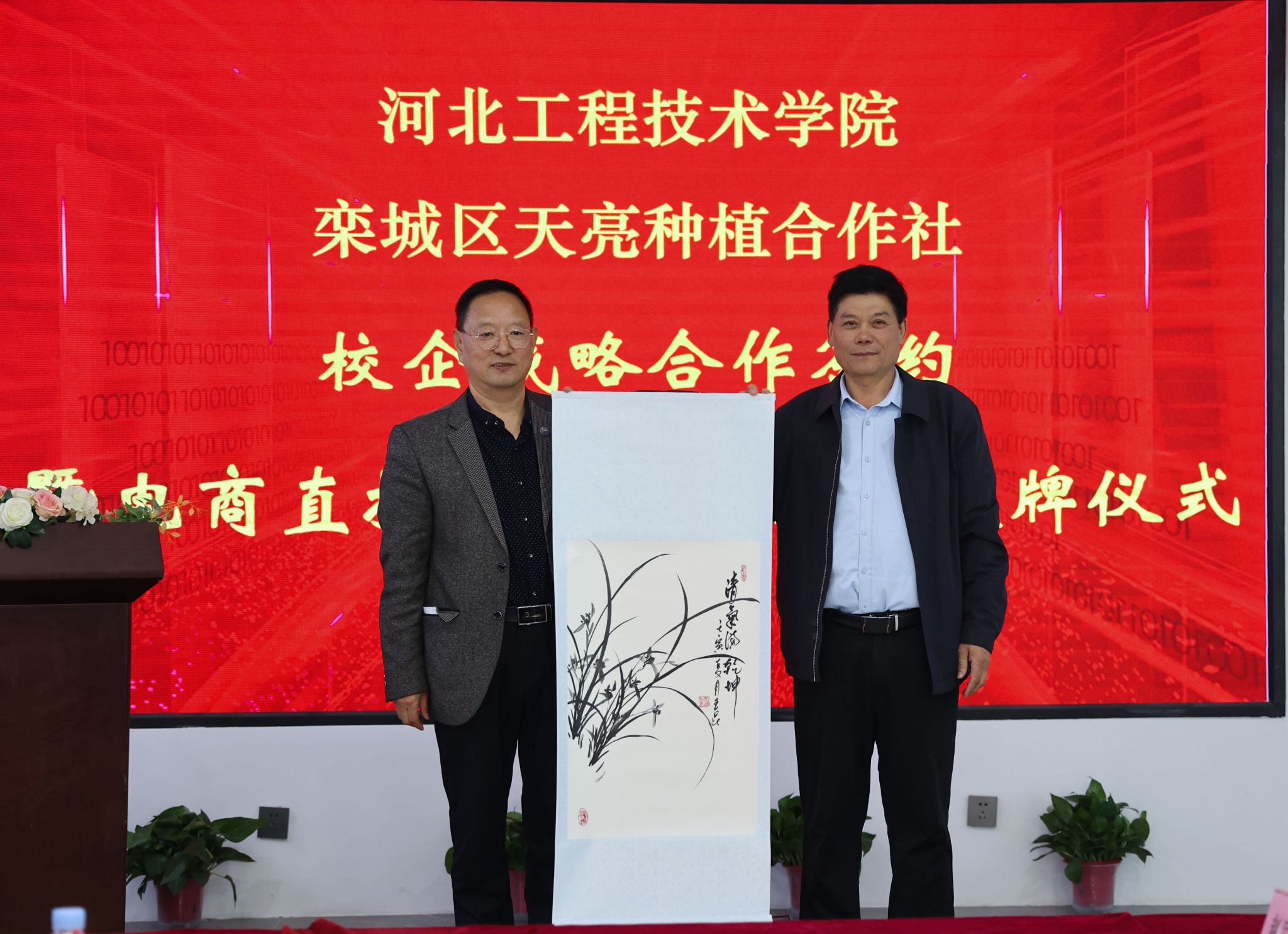最后,王明吉院长与赵军海董事长代表合作双方签署了校企战略合作协议,王昊副院长向赵军海董事长颁授“电商直播实践教学基地“牌匾”;合作协议的签署标志着双方合作迈入了实质性阶段,双方将共同把基地打造成联合人才培养和创新实践的平台。王俊昆处长代表学校向赵军海董事长赠送了文化礼品。