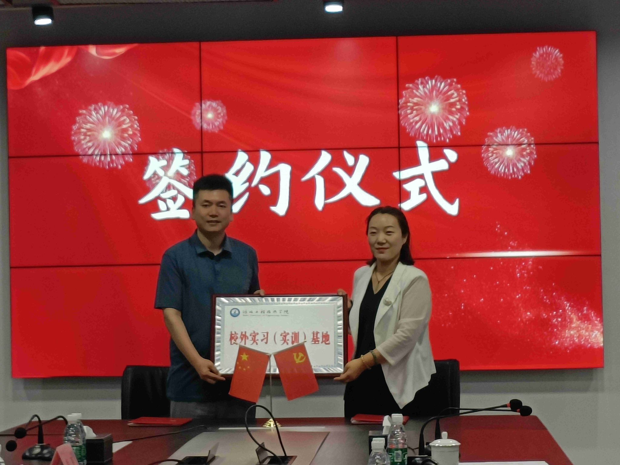 赵冬梅院长与张长河董事长代表校企双方签署了校企合作协议,张波副院长代表学校为企业颁发了“校外实习(实训)基地”牌匾。王俊昆处长还向企业赠送了兰花国画作品。