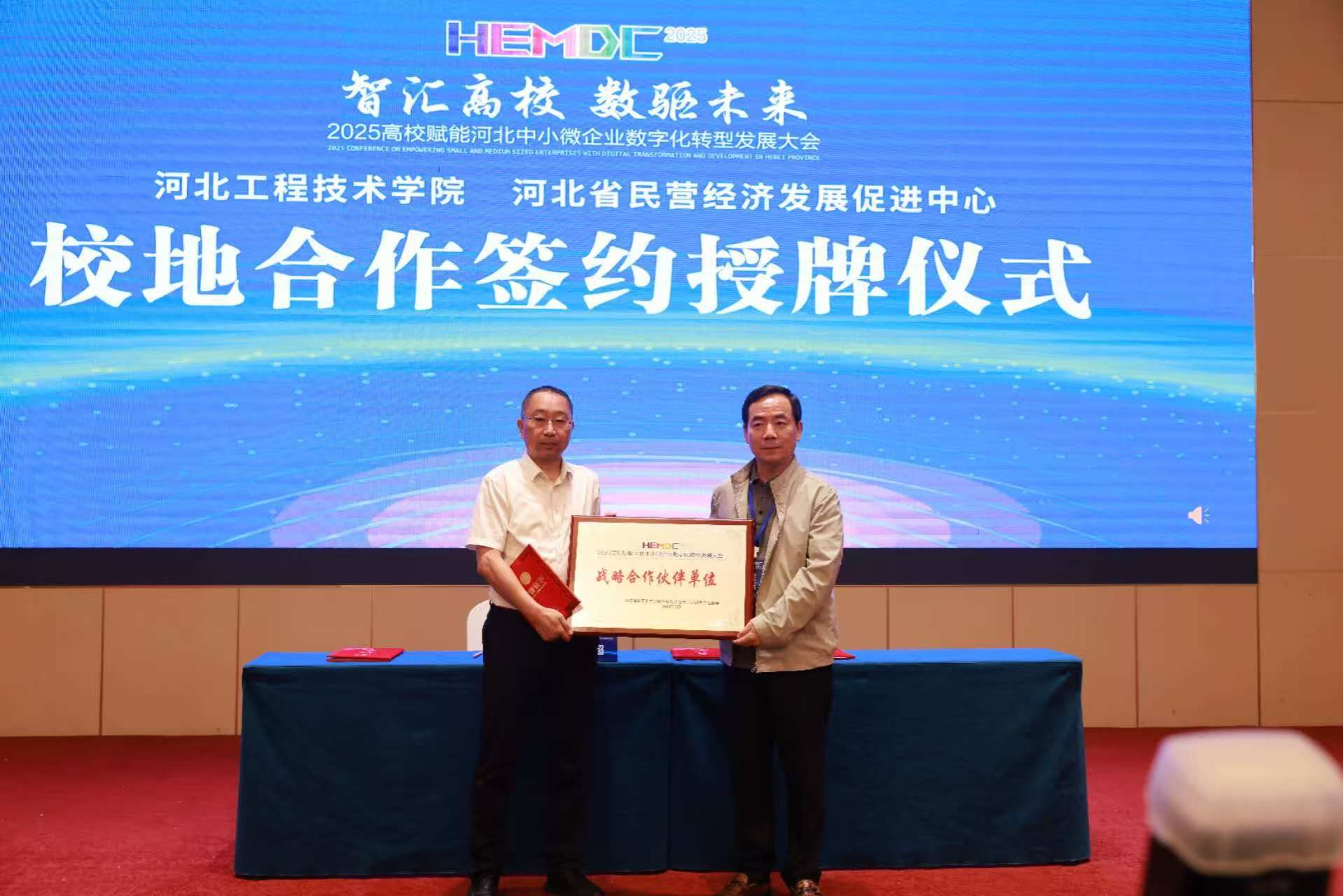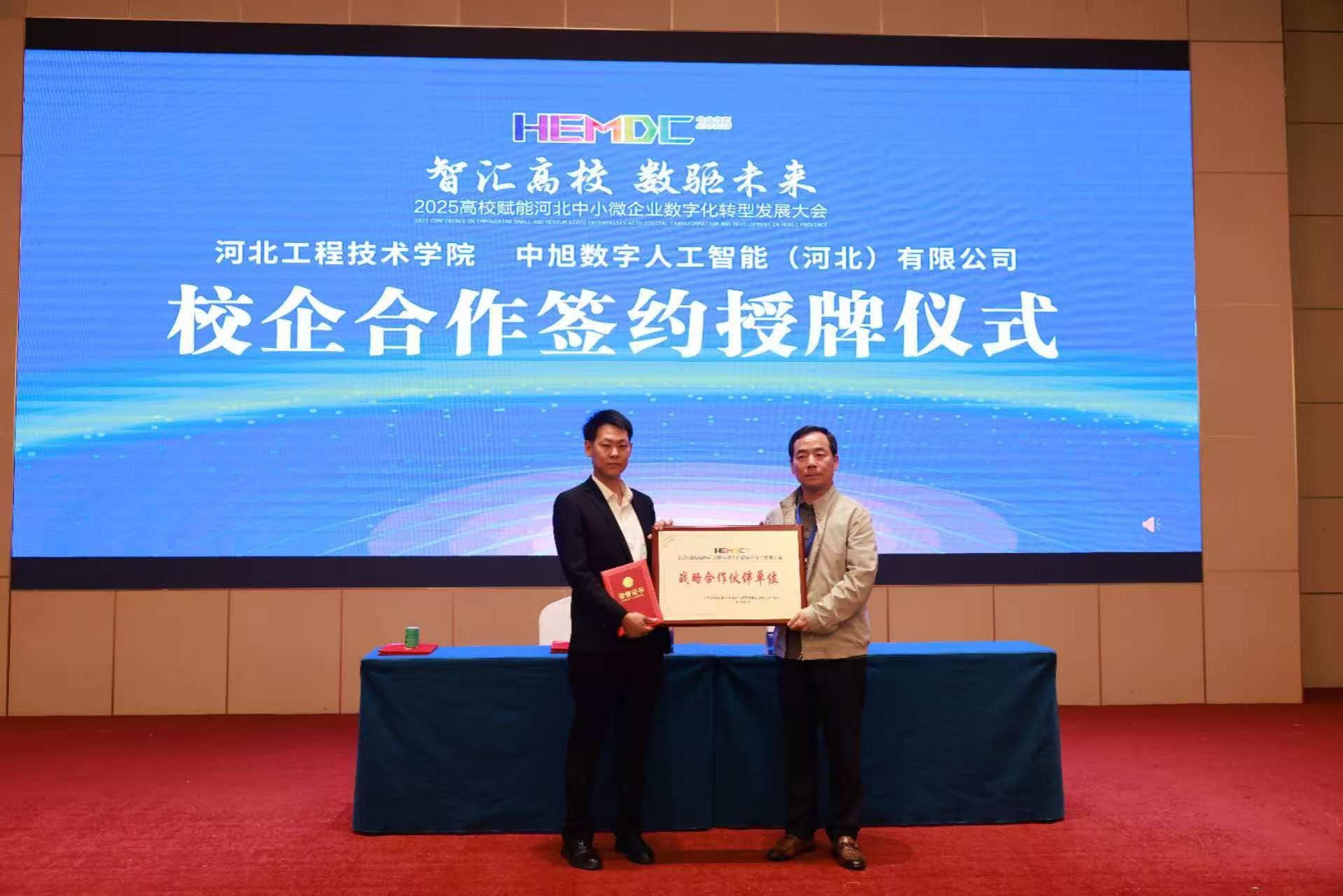 武勇副校长在大会致辞中强调,数字化转型是企业的“生存题”,高校作为区域经济发展的“智慧引擎”,必须主动担当使命。他指出,学校将深化校企合作,通过人才培养、技术研发和成果转化,为中小微企业提供“轻量化、低成本”的转型方案,推动传统产业焕发新动能。在活动现场,武勇副校长代表学校与河北省民营经济发展促进中心、中旭数字人工智能(河北)有限公司分别签署校地战略合作协议和校企合作协议,并颁发战略合作伙伴牌匾,标志着产学研协同迈入新阶段。
