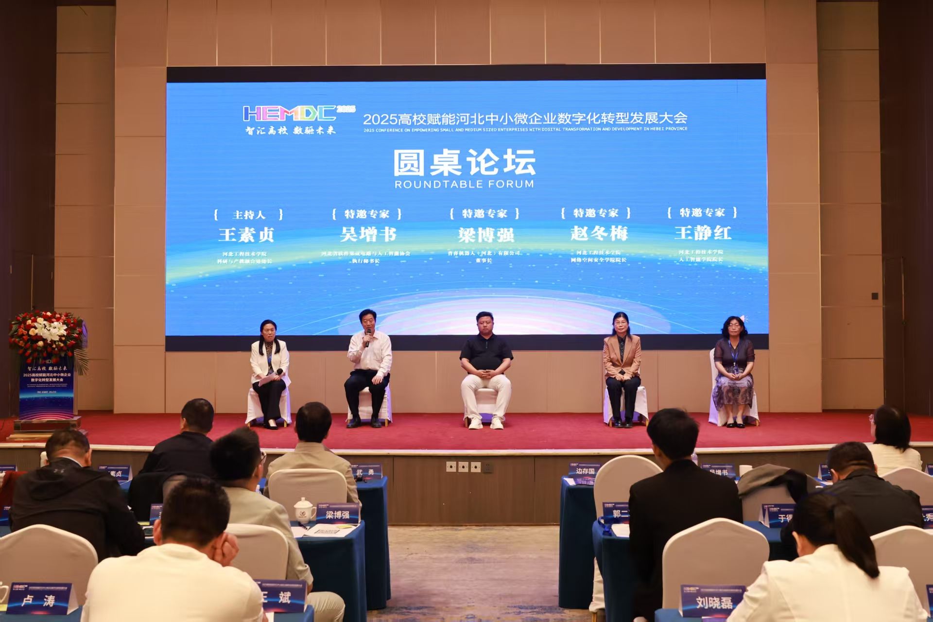在专家研讨环节,科研与产教融合处处长王素贞教授邀请网络空间安全学院院长赵冬梅、人工智能学院院长王静红与河北省软件集成电路与人工智能协会执行秘书长吴增书、普睿机器人董事长梁博强等嘉宾展开深度对话,直面河北企业转型中“技术基础薄弱、人才短缺”等痛点,提出“校企联合攻关、分阶段实施”等解决方案。河北省民营经济发展促进中心副主任赵景超表示,将联合高校构建资源共享平台,推动政策、技术、服务精准对接。参会企业代表河北臻豆食品有限公司董事长赵建立感慨,大会犹如“及时雨”,为企业破解转型难题提供了切实抓手。
