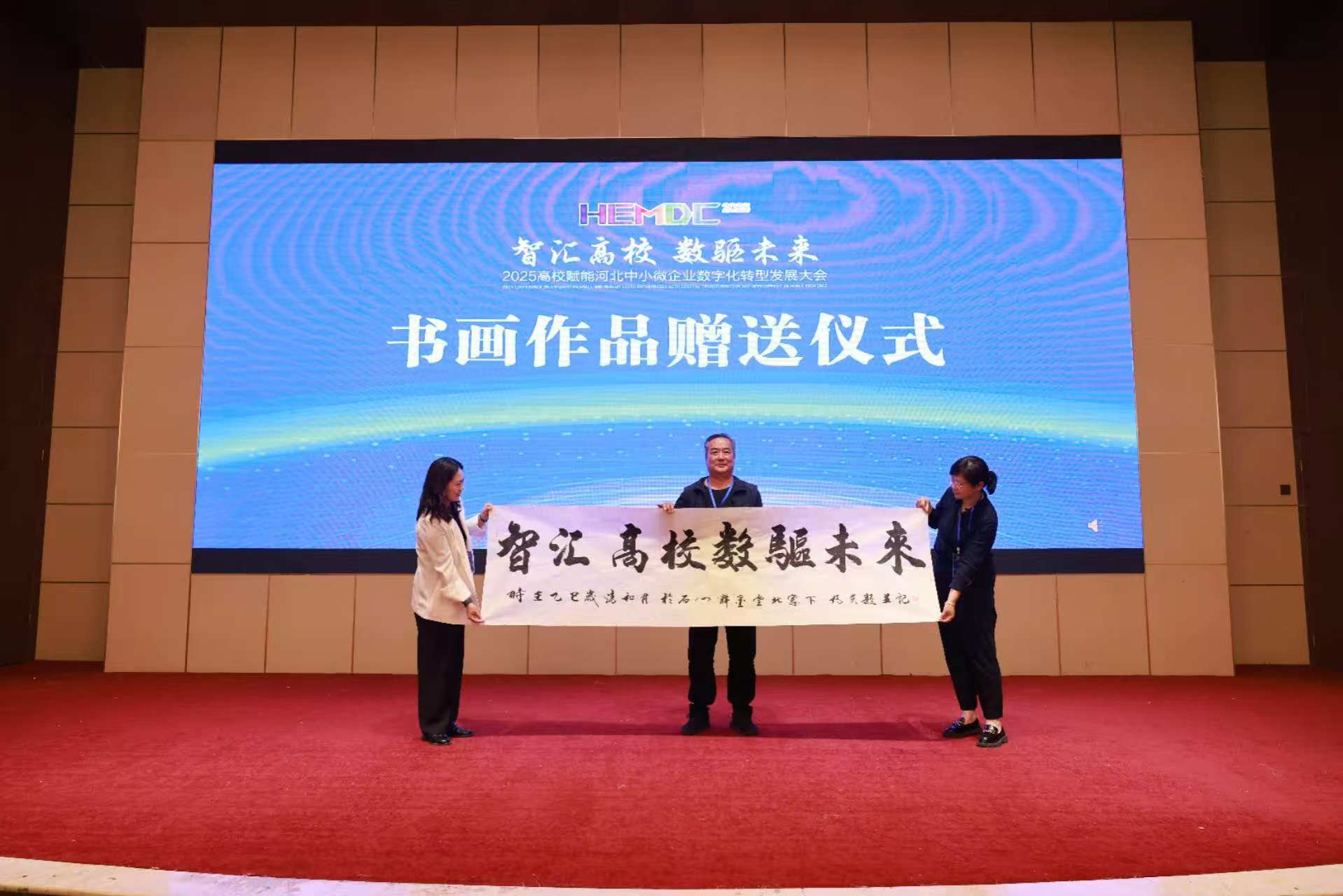 大会还迎来艺术与科技的融合时刻,我省著名书法家赵九凌、书画家张永庆向大会赠送主题书画作品,以传统文化笔墨礼赞数字化转型的时代浪潮。