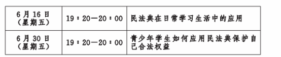 1.线上学习。全省教师和青少年学生通过“河北司法行政在线”“河北普法”“律正青少年”等微信公众号平台收看民法典线上直播讲座,进行民法典知识学习。直播安排如下: