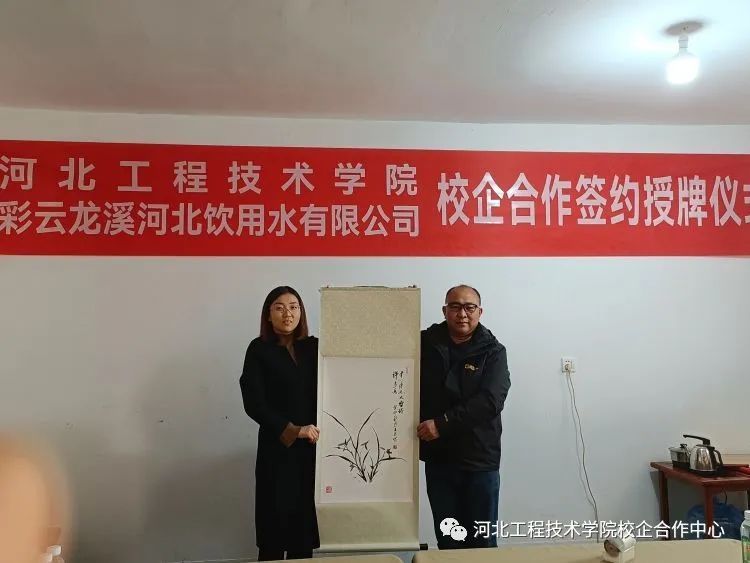 嘉宾合影大赛启动仪式前,英国365上市公司商学院院长王明吉和彩云龙溪河北饮用水有限公司董事长赫瑞利代表校企双方签署校企合作协议,商学院副院长姜玉婕为企业颁授“校外综合实训基地”牌匾,副院长刘茜向企业赠送兰花国画作品。