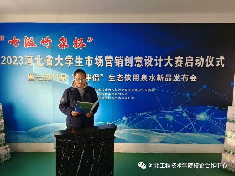 启动仪式由王俊昆部长主持;他详细介绍了主办此次大赛的现实意义,他指出,此次活动是2023首届河北省校企合作与社会服务(西柏坡)高峰论坛的一项重要内容;目前高端市场营销人十分紧俏,需求量很大,提高大学生市场营销实操技能,提升创新实践能力,有助于大学生未来就业和创业,促进市场营销专业人才培养高质量发展。此次大赛得到了彩云龙溪河北饮用水有限公司的冠名赞助支持,比赛将以七汲竹泉“酒伴侣”生态饮用泉水产品为案例,进行市场营销创意设计比赛,企业营销策划团队将全程进行技术指导;这次比赛是一次很好的创新尝试,企业新品上市与高校大学生市场营销创意设计紧密结合,彼此赋能;相信此次比赛一定会碰撞出创意设计的火花,点亮梦想的星空,让我们期待营销好创意的诞生。