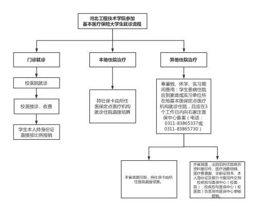 3、寒暑假、休学、实习期间费用:学生患病住院应到家庭或实习单位所在地基本医保定点医疗机构就诊住院,且应在3个工作日内向石家庄医保中心备案(电话:0311-83865337或0311-83865730)。本省就医住院,持社保卡由所住医院直接结算。外省就医,出院后将住院病历资料复印件、医疗消费明细、医疗费票据、诊断证明书、本人身份证及银行卡复印件交到校疾控与医保中心(校医院),校疾控与医保中心(校医院)负责到市医保中心审核报销,详见附件2。