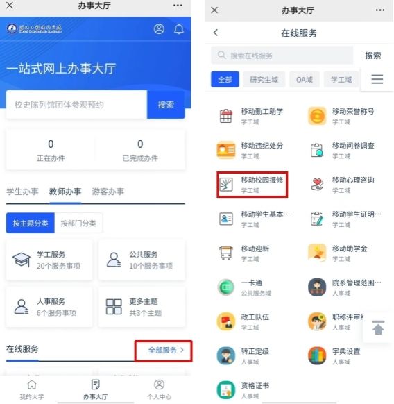 、用自己的“学号/工号”和“密码”登录后,选择“全部服务”——“移动园校报修”项目,如下图所示: