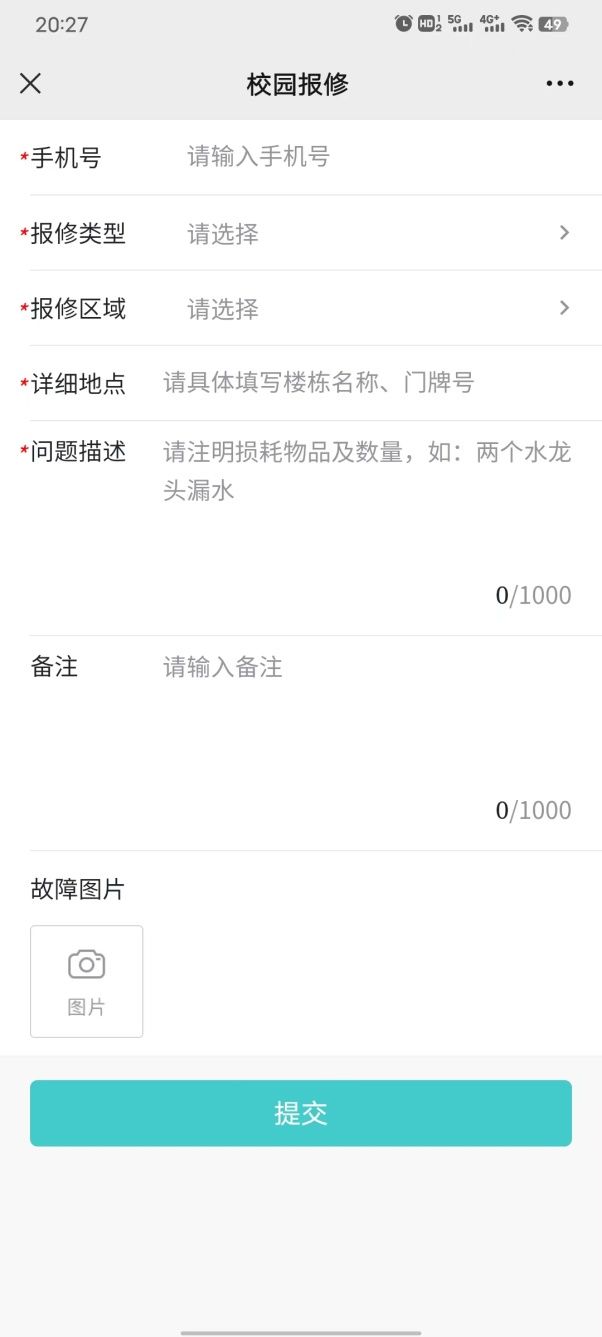 6、带“*”项目为必填项目,所填信息要准确完整,故障点位照片拍照清晰可辩,方便维修师傅准备材料精准高效维修。所有信息填写完成后点击“提交”按钮完成报修任务。