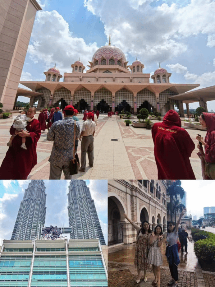 3.吉隆坡打卡地。在马来西亚昔日的首都吉隆坡这片热土之上,各个民族汇聚形成了丰富的风土民情。各民族和谐共处,各族文化交相辉映,彼此融合形成了独特且极富特色的马来西亚文化。英国365教师团队非常有幸地打卡了颇负盛名的几个地标性建筑:高耸入云的双子塔(吉隆坡石油双塔、马来西亚的名片、世界上最高的双塔楼),颜值逆天且冒着粉红泡泡的粉红清真寺(顶部由花岗石砌成的粉红色穹顶,视觉效果一流且令人震撼,女性和男性均需着红色长袍进入,忌大声喧哗和比手势拍照)等。