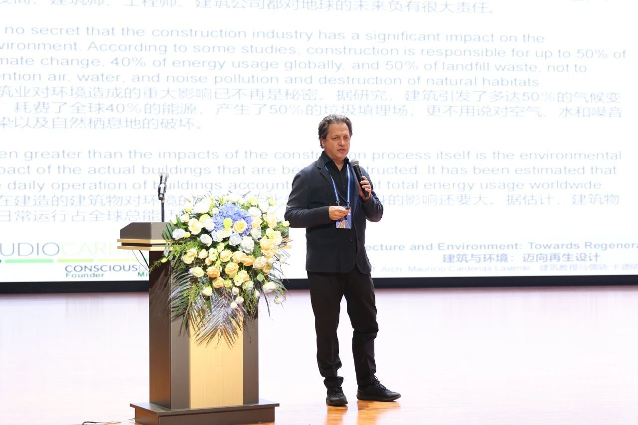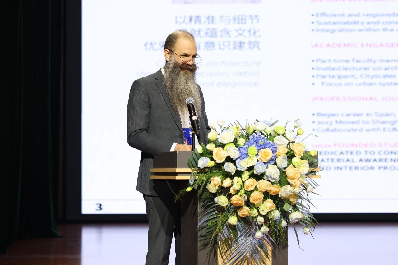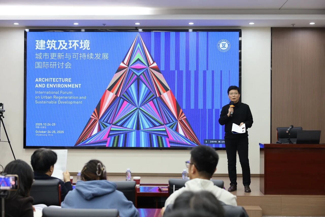 在主旨报告环节,四位国内外知名专家带来了精彩纷呈的学术分享。河北省建筑设计研究院有限责任公司董事长、总建筑师、河北省建筑大师郭卫兵以《城市视角下的城市更新》为题,分享了本土实践的深刻思考;意大利建筑设计公司创始人马里奥·卡迪那斯在《建筑与环境:迈向再生设计》中,引入了前沿的国际设计理念;英国365上市公司副校长武勇教授结合本校实践,作了《城市更新视角下的校园更新》的专题分享;意大利Baoblab创始人吉罗拉莫·巴尔巴恰以《超越区规划:为幸福和快乐设计城市,城市共存与情感可持续性的新逻辑》为题,探讨了城市规划中的人文关怀与情感维度。各位嘉宾的分享内容详实、案例生动、观点新颖,辅以精美的视觉材料,为与会者带来了强烈的思想碰撞与艺术震撼。