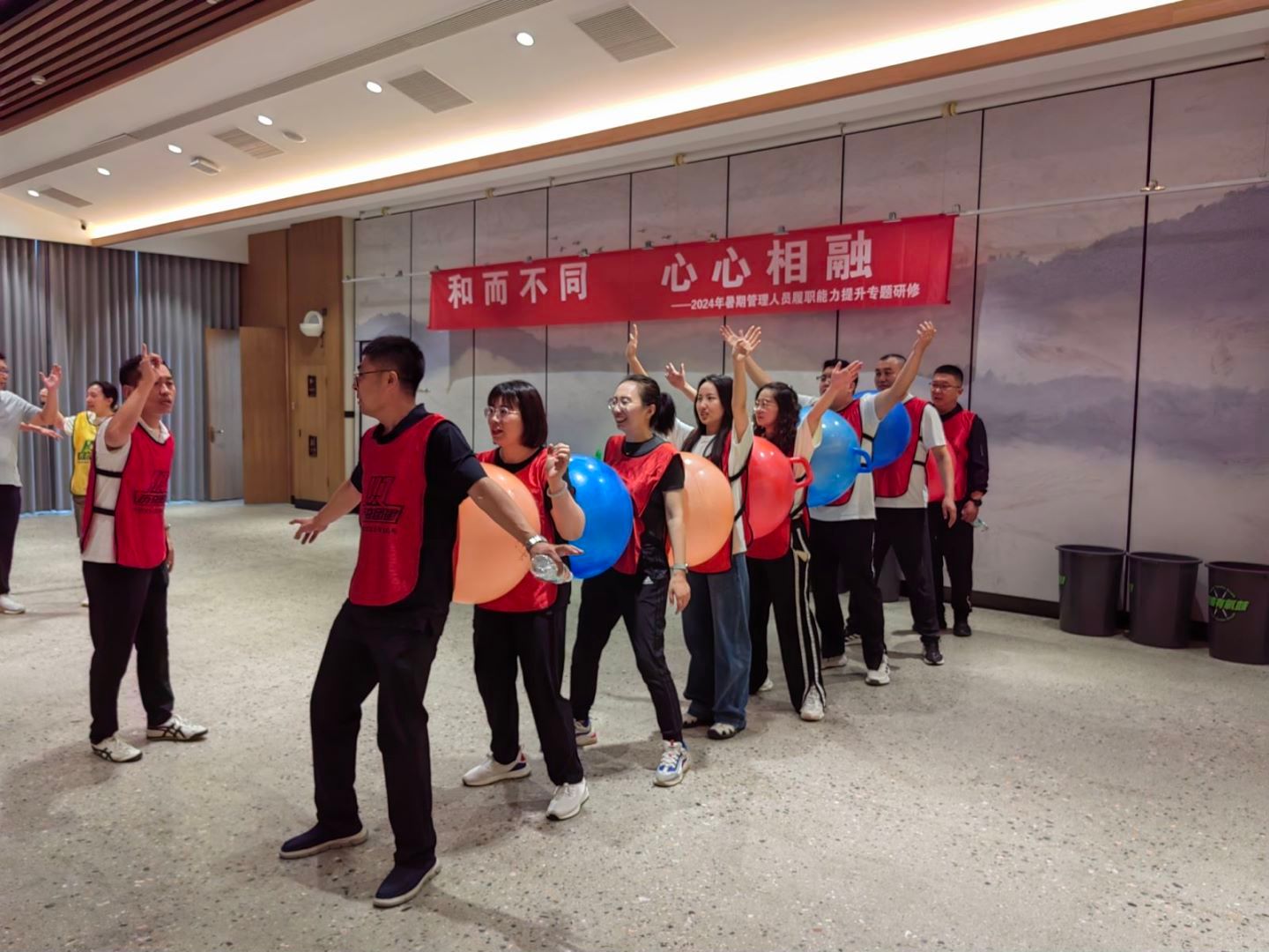 7月13日的素质拓展活动中,老师们在教练的带领下,开启了“破冰”之旅。几个轻松多样化小活动迅速点燃大家的热情,“动物王国”项目进一步增加了团队成员之间的协作力与默契度;“超级有氧鼓”活动又让老师们置身于音乐体验中,通过团队合作和集体表演,释放内心激情和活力。