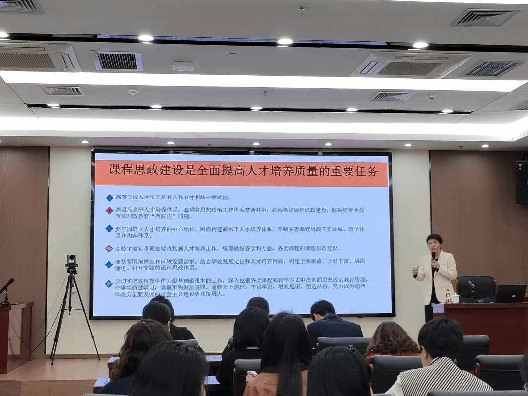 赵霞主任从《高等学校课程思政建设指导纲要》解读、课程思政相关评审要点、课程思政建设常见问题以及建设路径等四个方面对“课程思政”的探索实践进行了介绍。