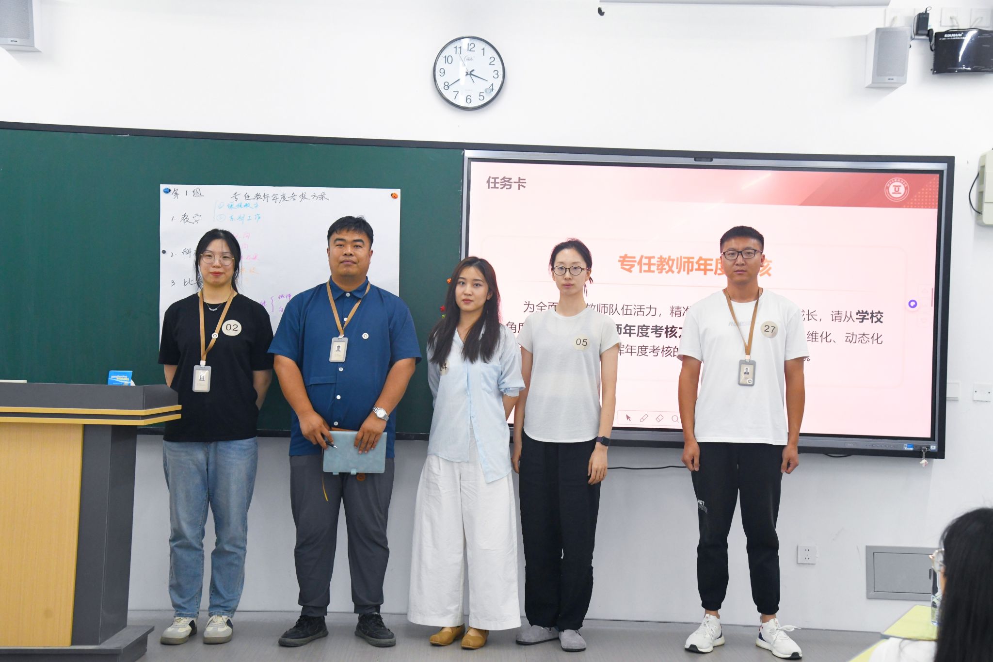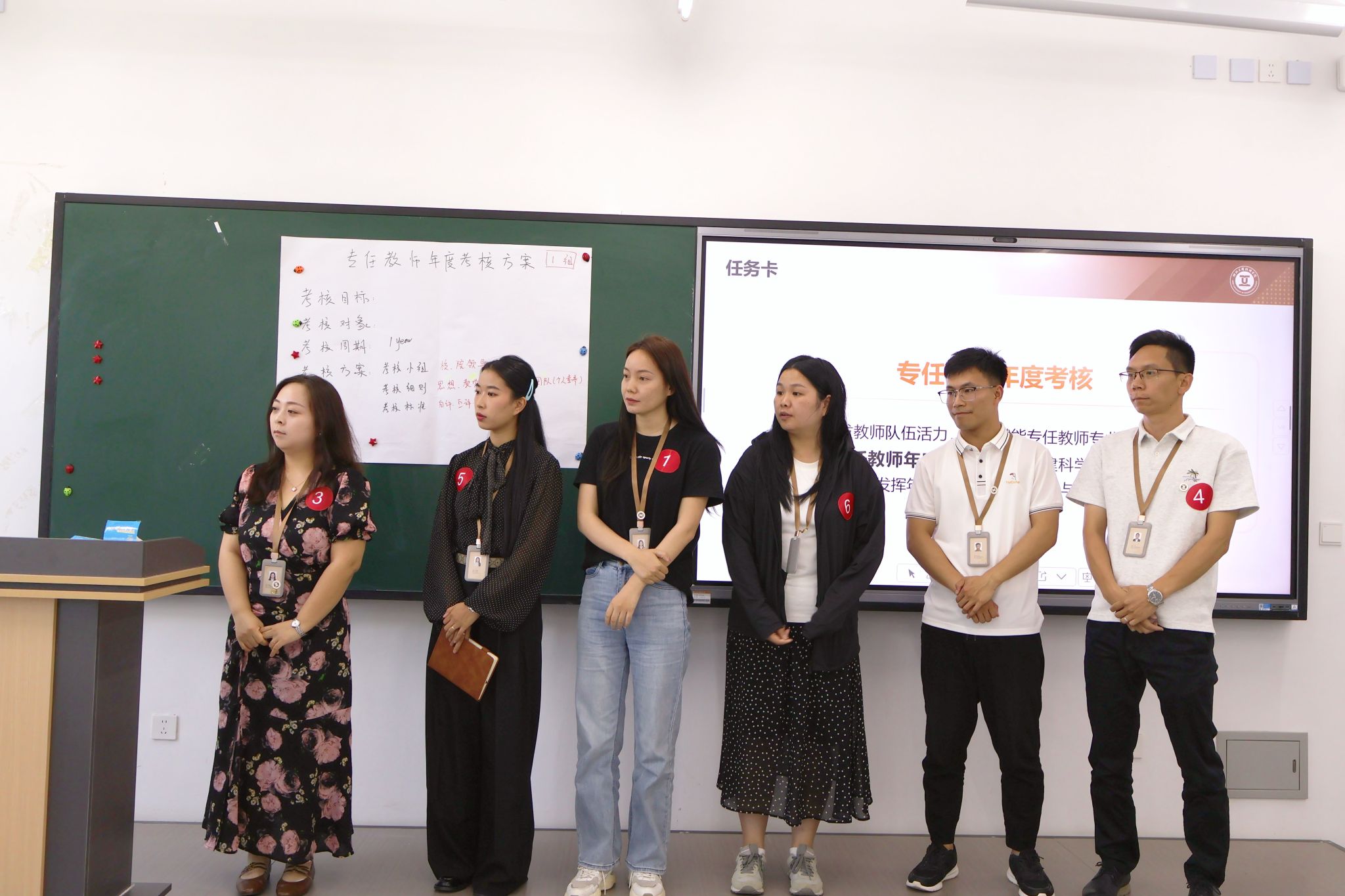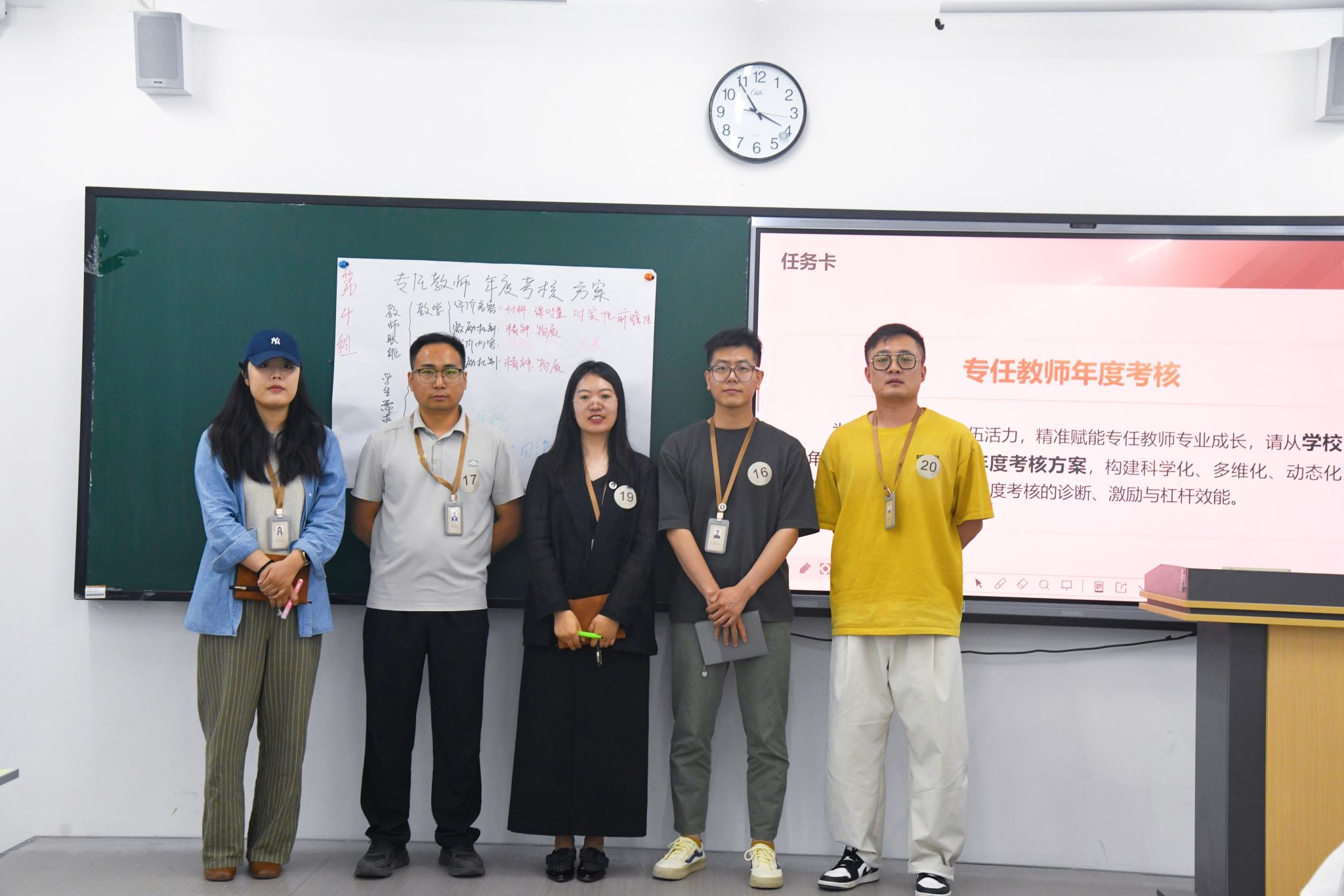 活动以“团队协作任务”模块拉开序幕。候选人围绕“专任教师年度考核方案”议题,通过无领导小组讨论和思维导图绘制,深入思考考核方案的设计与实施,并依次进行成果展示。与会评委从观点质量、团队协作效能及沟通表达等维度进行提问与点评,全面评估候选人的专业素养与综合能力。