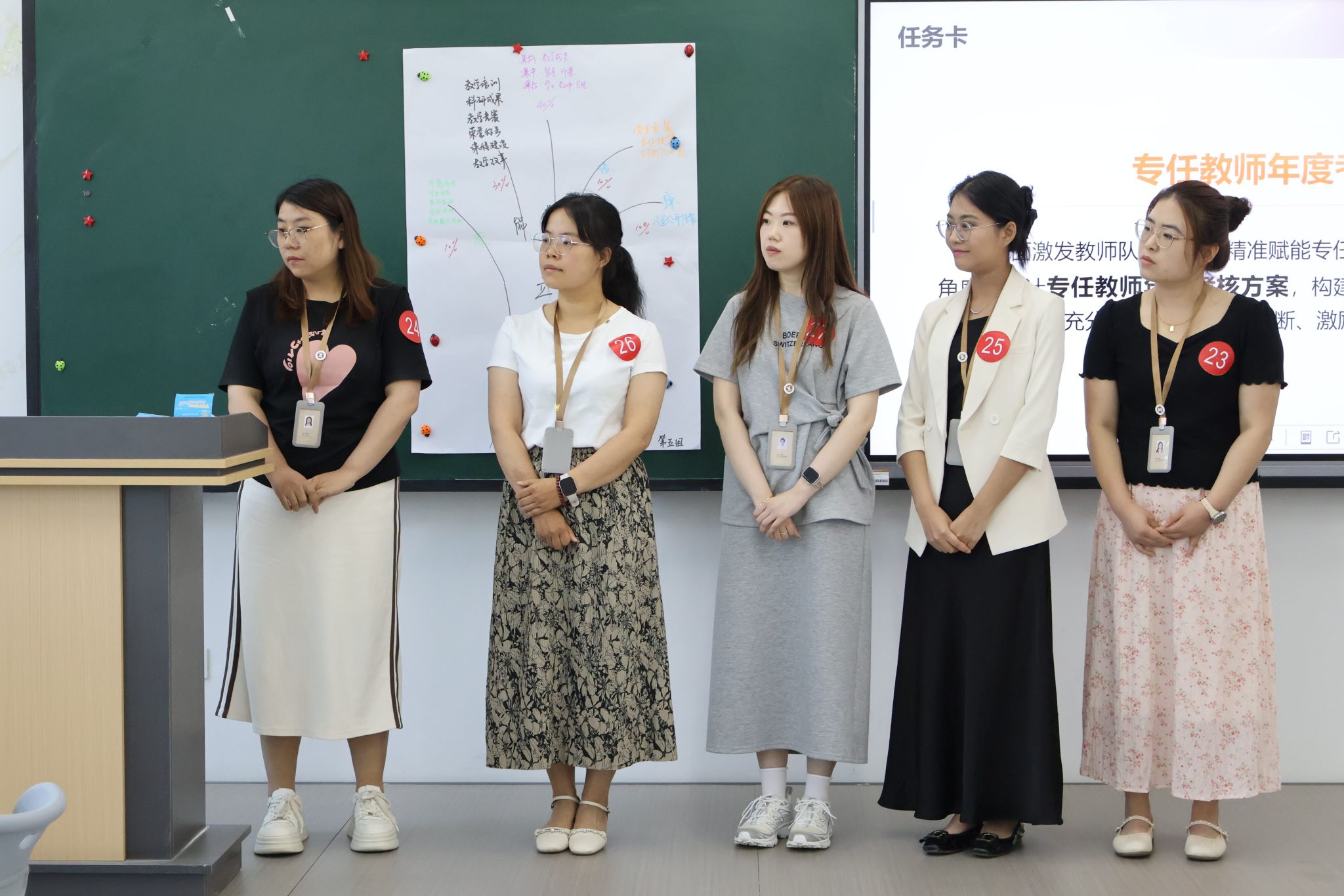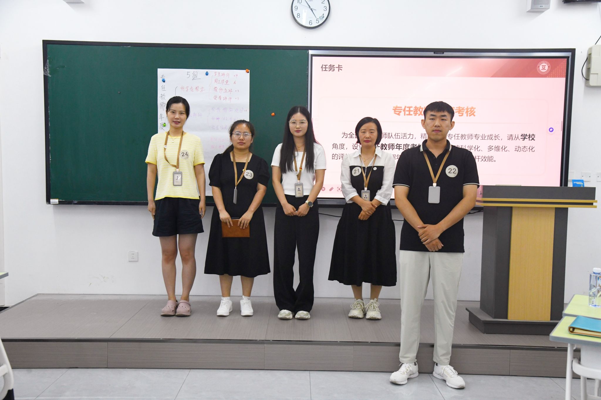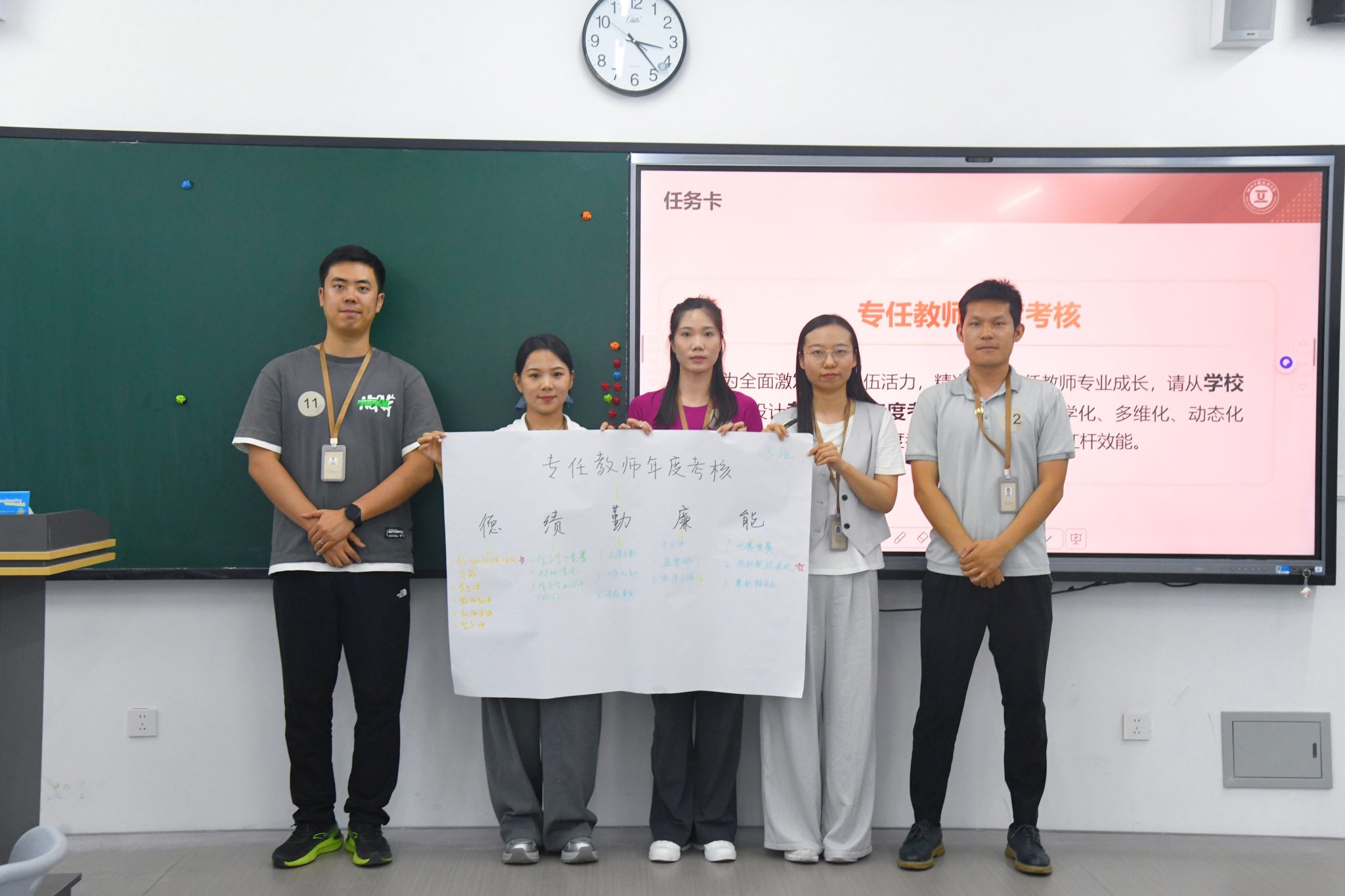 活动以“团队协作任务”模块拉开序幕。候选人围绕“专任教师年度考核方案”议题,通过无领导小组讨论和思维导图绘制,深入思考考核方案的设计与实施,并依次进行成果展示。与会评委从观点质量、团队协作效能及沟通表达等维度进行提问与点评,全面评估候选人的专业素养与综合能力。