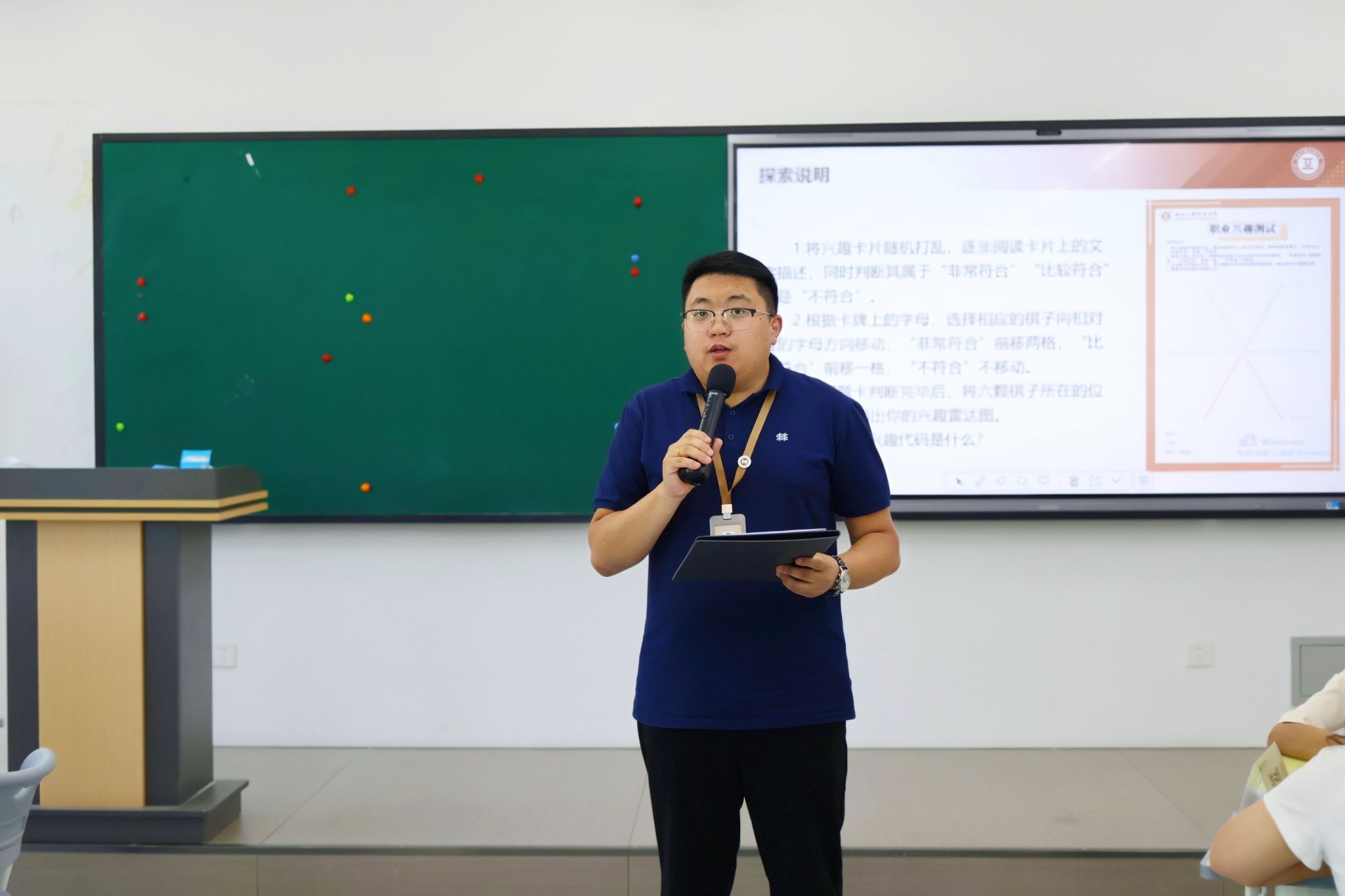 在“职业兴趣探索”模块,素质教育学院副院长王健以霍兰德职业兴趣理论为指导,引导候选人绘制兴趣雷达图并获取兴趣代码,精准定位职业倾向,为个人发展规划提供科学依据,同时为学校“人岗匹配”机制提供数据支撑。