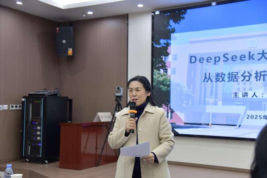 在报告中,郭教授首先系统介绍了数据分析的五个主要阶段,并详细阐述了每个阶段的发展历程及特点。随后,他深入讲解了DeepSeek大模型的基本原理、分类、发展历程及当前研究现状。结合自身的研究成果,郭教授重点探讨了DeepSeek大模型在数据分析、自然语言处理、图像识别等领域的应用,并展望了其在智能创作、人机交互等方面的未来发展趋势。最后,他强调了DeepSeek大模型应用的广泛性,鼓励教师们将其应用于学科研究、专业建设及科研项目中,通过申报科研项目、横向课题等形式,服务地方经济发展。
